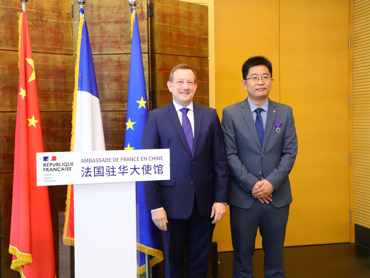 French Ambassador to China Mr. Bertrand Lortholary presented the Palmes Académiques award to Prof. DAI Zhanwu.