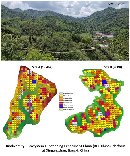 BEF-China experiment sites and the map of the different diversity levels (photo by Xiaojuan Liu)