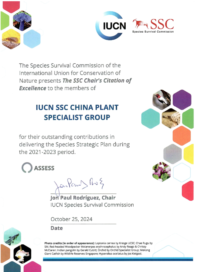 The IUCN SSC China Plant Specialist Group was Honored with the "SSC Chair's Citation Excellence" at the 5th IUCN SSC Leaders' Meeting