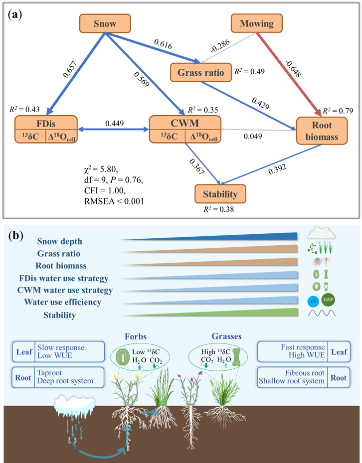 The improvement in productivity stability was closely linked to diverse behaviors of plant stomata. Additionally, communities with more grasses tend to exhibit higher stability, because grasses can respond rapidly to environmental changes. Deepened snow intensified water loss from transpiration via higher stomatal conductance, whereas grasses were still able to maintain a high WUE to stabilize the productivity through enhanced photosynthetic capacity. Deepened snow also increased the root biomass, improving plants' ability to obtain more water and further promoting the productivity stability.