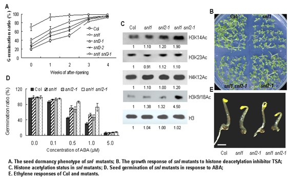 SIN3 acts as a scaffold protein recruiting histone-binding proteins RbAp46/RbAp48 and HDAC1/HDAC2, which deacetylates the core histones resulting in a transcriptionally repressed state of the chromatin. It is essential in Drosophila and mouse, as sin3 mutants die during early stage of development. However, little is known about the importance of the SIN3-LIKE (SNL) protein family in growth and development of plants. Prof. Yongxiu Liu’s group from Institute of Botany, Chinese Academy of Sciences shows strong genetic evidence for a redundant function of SNL1 and SNL2 in the regulation of seed dormancy in Arabidopsis (Wang et al. Plant Cell 2013 25:149-166). The results also indicate that SNL1 and SNL2 could act as components of the HDAC-SNL complex to modulate the transcription of genes involved in the ethylene and ABA pathways by modifying their histone acetylation abundance. Enhanced ABA-ethylene antagonism in the snl mutants results in altered seed dormancy.