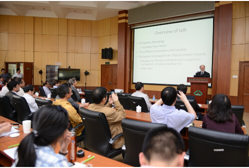 Following the ceremony,Prof. Chapin gave a lecture titled Linking ecosystem science to action in a warming world. In his lecture, Professor Chapin discussed how global climate warming affects ecosystem services and the sustainability of human society. He introduced the concept of Earth Stewardship: active shaping of pathways of social and ecological change for benefit of ecosystems and society. He identified three general approaches to stewardship: 1) Reduce rates of preventable changes, such as reduce carbon emissions and reduce threats of stream pollution; 2) Adapt to and shape changes that cannot be prevented, such as prepare to live in a warmer climate, and expect droughts and floods; 3) Avoid or escape unsustainable traps, such as develop renewable energy. Professor Chapin also pointed out that collaborations between China, U.S. and European Union could greatly help to reduce rate of climate change and shape the pathway of inevitable environmental change.