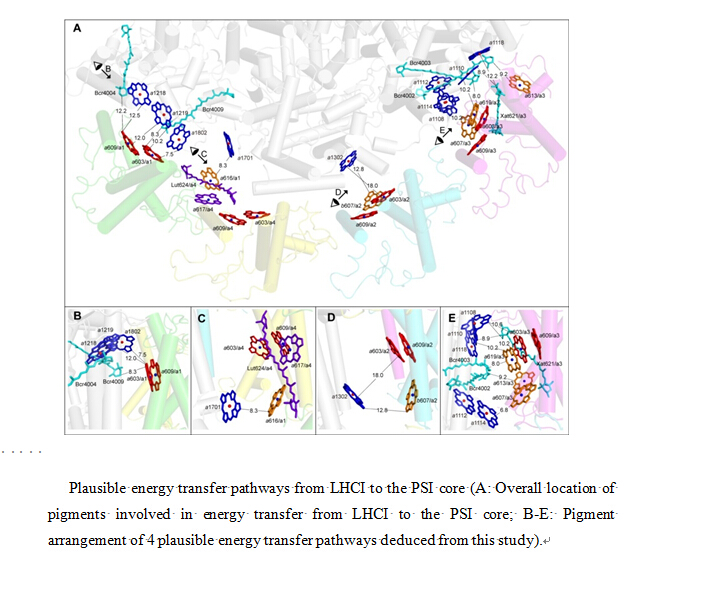Based on the structure resolved, the chlorophyll a and b were differentiated in the 4 Lhca subunits for the first time, and the location and geometrical arrangement of each pigment were revolved, yielding a new pigment network of LHCI. Furthermore, the structure and organization of special chlorophylls - red Chls, in LHCI, were revealed, and 4 plausible energy transfer pathways from LHCI to the PSI core complex were deduced. In addition, detailed differences among the 4 Lhca subunits and their interactions, and the interactions between Lhca subunits and PSI core subunits, were elucidated.