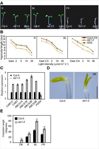 (A) siz1-2 seedlings exhibit a short-hypocotyl phenotype.(B) Hypocotyl length of five-day-oldseedlings at the indicated fluence rates of lights. (C) The enhanced responsiveness of light-responsive genesin siz1-2 seedlings compared to those in the wild type. (D) siz1-2seedlings exhibit unfolded apical hooks under dark conditions. (E) siz1-2 seedlings show more opened cotyledon compared to Col-0.