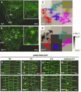 (A-D) Results of microrheological analysis show high apparent local viscosity in central gravity-sensing cells from ARP3 mutant dis1-1, which might caused by the surrounding thick actin bundles. (E-L) ARP3 mutant dis1-1 displays a delayed recovery of PIN2-GFP cycling after Brefedlin A washout.