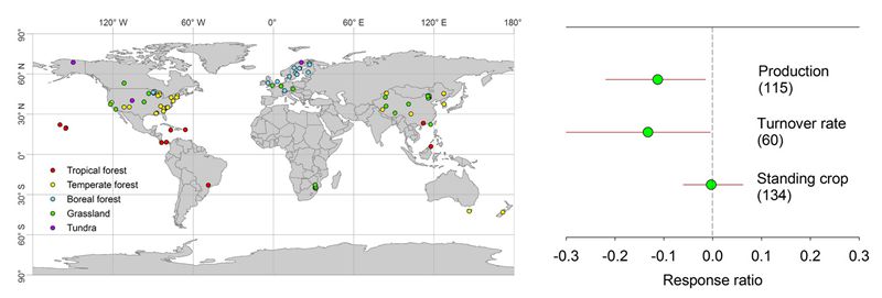 The addition of N significantly decreased root production and turnover rate at the global scale