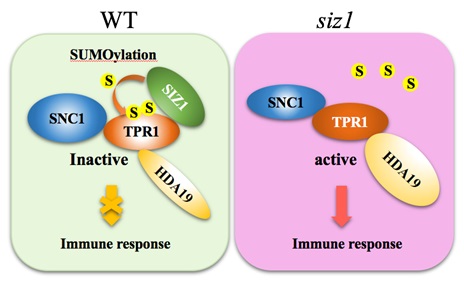 Recent studies suggest that a SUMO (Small Ubiquitin-related Modifier) E3 ligase SIZ1-mediated SUMO modification may represses SNC1-mediated immune response, but the detailed molecular mechanism remains to be elucidated. Covalent conjugation of a SUMO to the lysine residue(s) of a target protein, a process referred to as SUMOylation, regulates protein stability, subcellular localization, enzymatic activity, and/or protein–protein interactions.