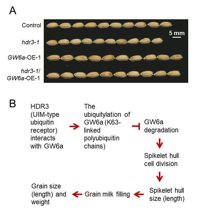 In a study published in Plant Cell, Dr. SONG Xianjun's group from the Institute of Botany of the Chinese Academy of Sciences revealed a non-proteolysis mechanism underlying the regulation of rice grain size: the ubiquitin-interacting motif-containing protein HOMOLOGUE OF DA1 ON RICE CHROMOSOME 3 (HDR3) interacts with and is responsible for the increased lysine (K)63-linked polyubiquitination of GRAIN WEIGHT 6a (GW6a, a chromatin histone acetyltransferase); this type of polyubiquitination modification stabilizes, but not de-stabilizes as in most cases, GW6a to regulate grain size.