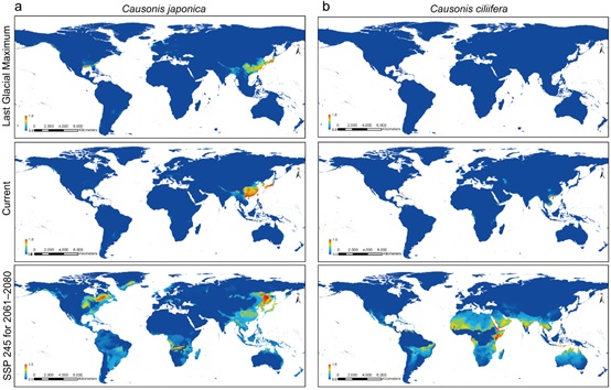 Fig. 3 The global distribution variations of wide-ranged Causonis japonica and narrow-ranged Causonis ciliifera under climate change.