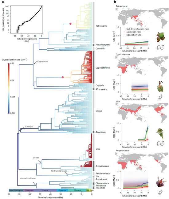 Biogeographic diversification patterns of the grape family, showing lineages of diversification rate shifts. (Image by IBCAS)