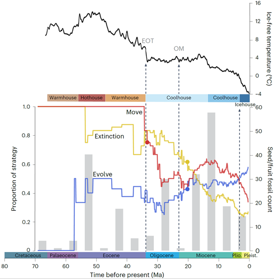 The researchers further identified the “move” strategy as dominant during the Eocene and Miocene, coinciding with the high global temperatures of both periods, while “evolve” has been the dominant strategy since the last glacial period at 3.3 Ma, when several new habitats emerged in both hemispheres.