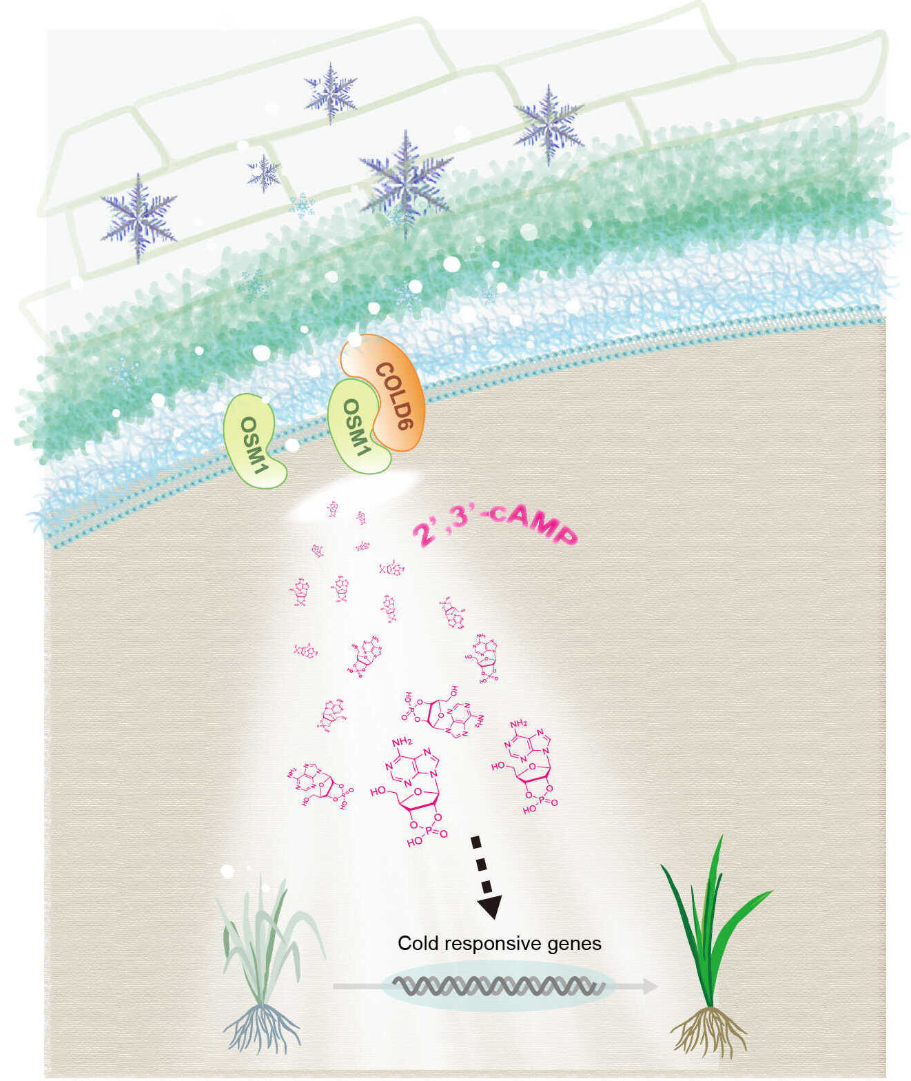 This cell membrane component, known as the COLD6-OSM1 module, triggers the production of a special molecule, 2',3'-cAMP, which helps plants sense and respond to low temperatures. This secondary messenger is a key upstream component that mediates the signaling pathway by directly responding to signals from cold sensors. Previous studies have found that cold sensors predominantly trigger a calcium ion (Ca2+) signaling pathway that acts as a secondary messenger, but few other molecules functioning as secondary messengers had been identified.