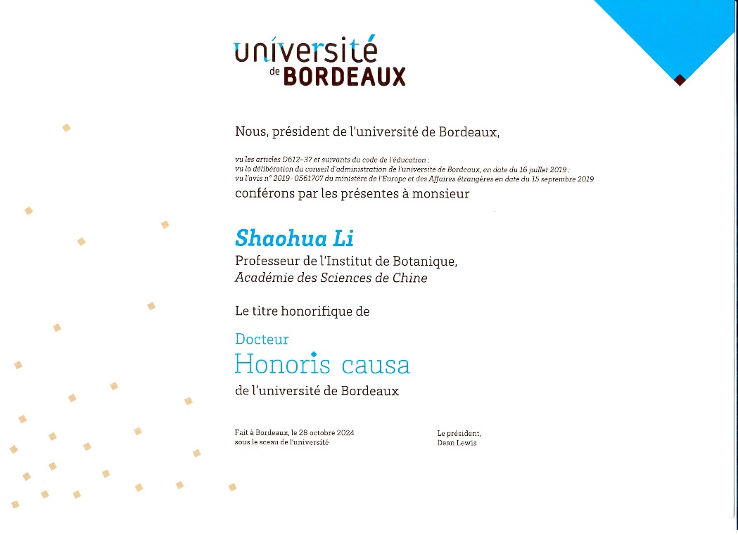 Recently, the University of Bordeaux in France conferred Prof. LI Shaohua from Institute of Botany, the Chinese Academy of Sciences, the honorary degree of Doctor of Philosophy (Docteur Honoris Causa) in recognition of his achievements in the field of grapevine scientific research and genetic breeding, as well as his contributions to the Sino-French scientific cooperation and academic exchanges in the field of grapevine and wine.