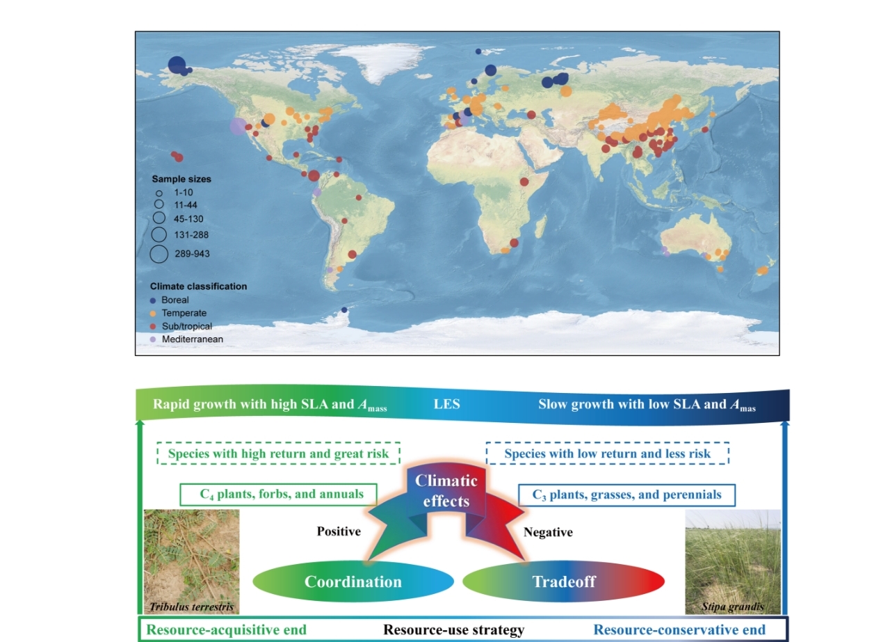 Data sites with geographical coordinates across global grasslands (top) and a conceptual diagram illustrating relationships among plant functional traits (bottom). (Image by SUN Kuo)