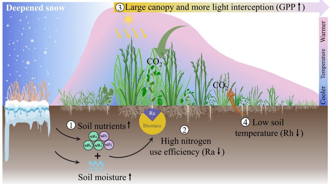 In this study, the researchers conducted a five-year snow manipulated experiment in Inner Mongolia and combined with multi-year high-frequency observations of ecosystem carbon flux, species surveys, and canopy structure analysis during the growing season in temperate grasslands. They found that deepened snow increased soil nitrogen and water availability, synergistically enhancing nutrient uptake and plant nitrogen use efficiency (NUE). Concurrently, C3 grasses charactered by higher NUE and greater height became dominant in deep-snow plots, further elevating community-level NUE.