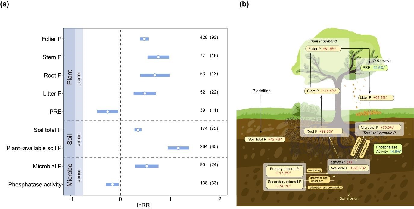 Overall effects of phosphorus addition on phosphorus cycling in terrestrial ecosystems. (Image by CHEN Zixin, FANG Jingyun and YAN Zhengbing)